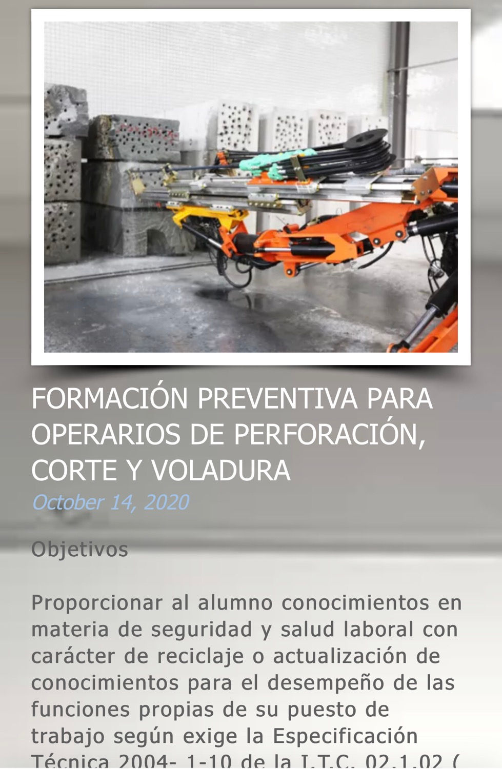 FORMACIÓN PREVENTIVA PARA OPERARIOS DE PERFORACIÓN, CORTE Y VOLADURATECMINA13 oct 20201 Min. de lecturaFORMACIÓN PREVENTIVA PARA OPERARIOS DE PERFORACIÓN, CORTE Y VOLADURA